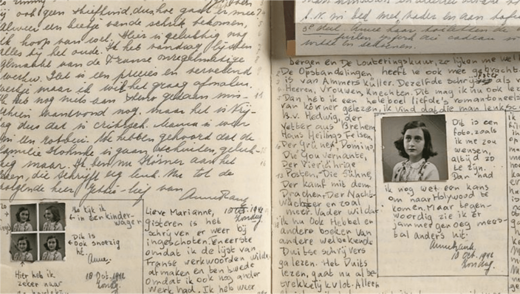 The sprawling notebook with its pasted photos and worn-in pages is a reminder of the rawness of evil. The blindingly loud bombs that terrorized the Franks and the Van Daans. Resorting to scraps of paper and a wastepaper basket to avoid making noises in approaching the bathroom. Smelling your own feces on your hands and all around you as you pray not to get caught and deported to a concentration camp.